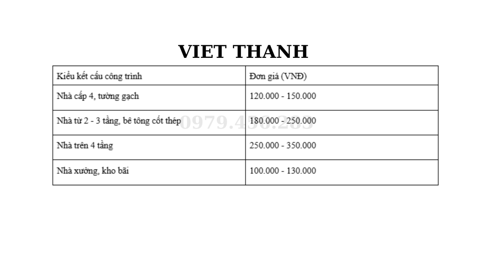 2. Bảng giá phá dỡ theo kết cấu công trình