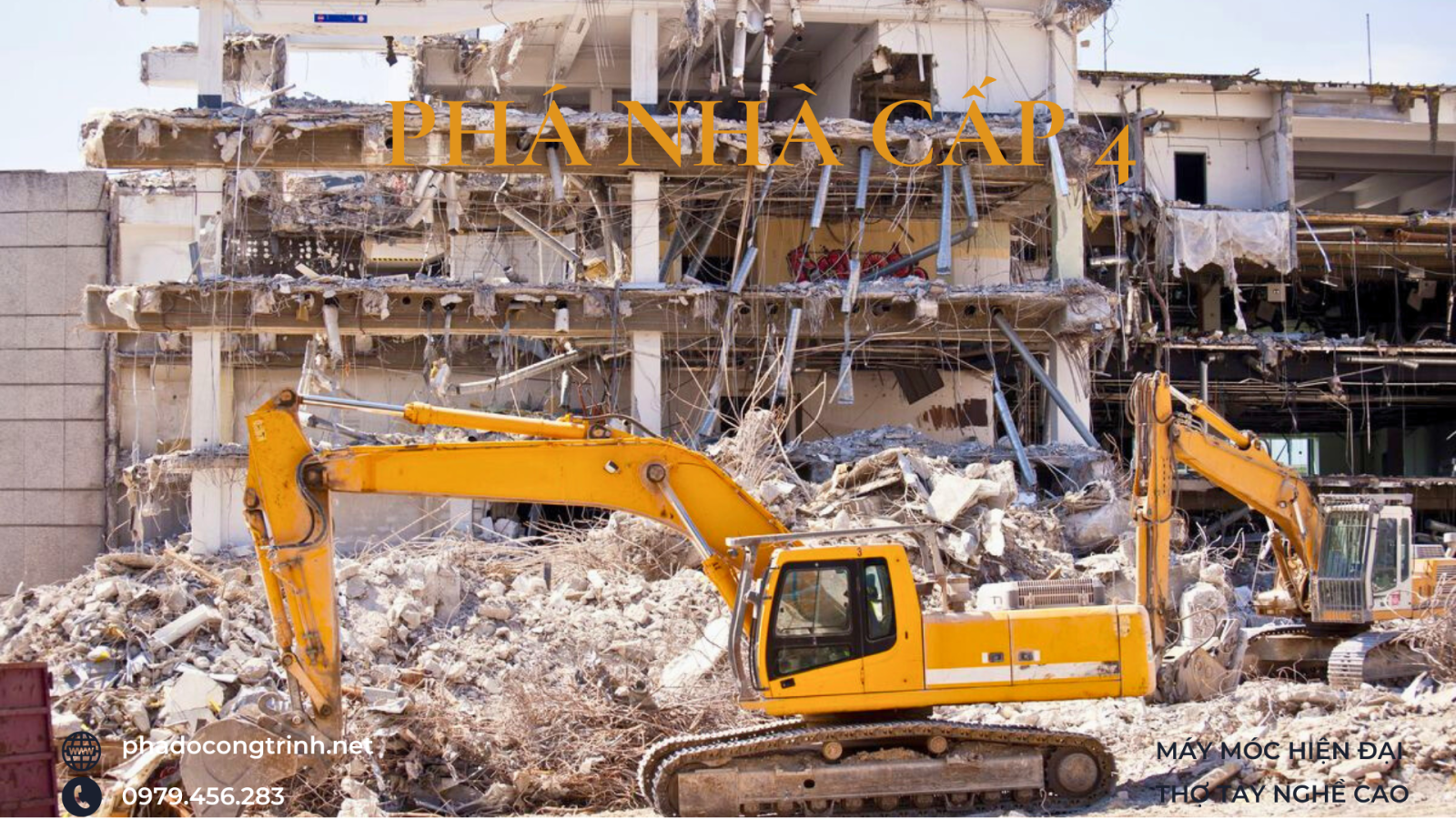 Công đoạn phá dỡ sẽ được thực hiện theo nguyên tắc từ trên xuống dưới, nghĩa là tháo dỡ mái nhà, trần sau đó mới đến tường, cột và cuối cùng là nền móng. Với nhà cấp 4, quá trình thường kết hợp giữa thủ công và máy móc hiện đại như máy khoan, máy cắt bê tông hoặc xe xúc. Cách làm này giúp kiểm soát tốt hơn, hạn chế sự cố sập đổ bất ngờ. Những khu vực nguy hiểm sẽ được đánh dấu và xử lý theo đúng kỹ thuật để đảm bảo an toàn cho công nhân cũng như những công trình xung quanh.