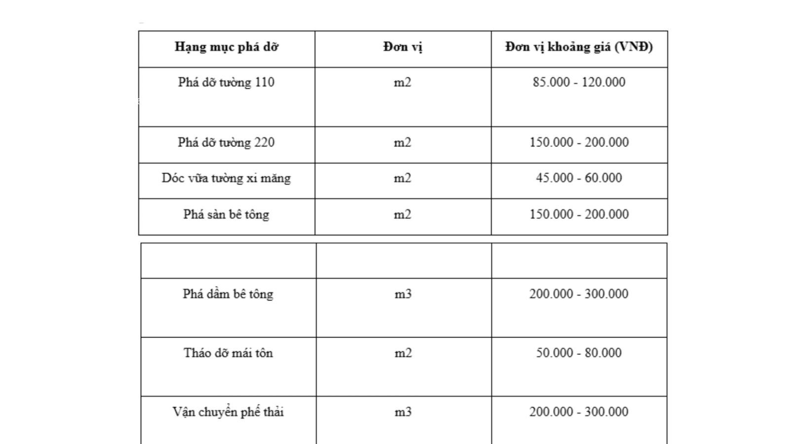 Dưới đây là bảng chi phí dịch vụ phá dỡ công trình xây dựng uy tín bạn có thể tham khảo. Đương nhiên các mức giá thực tế sẽ có sự chênh lệch tùy thuộc vào điều kiện hoàn cảnh, thời gian và địa điểm thực hiện.