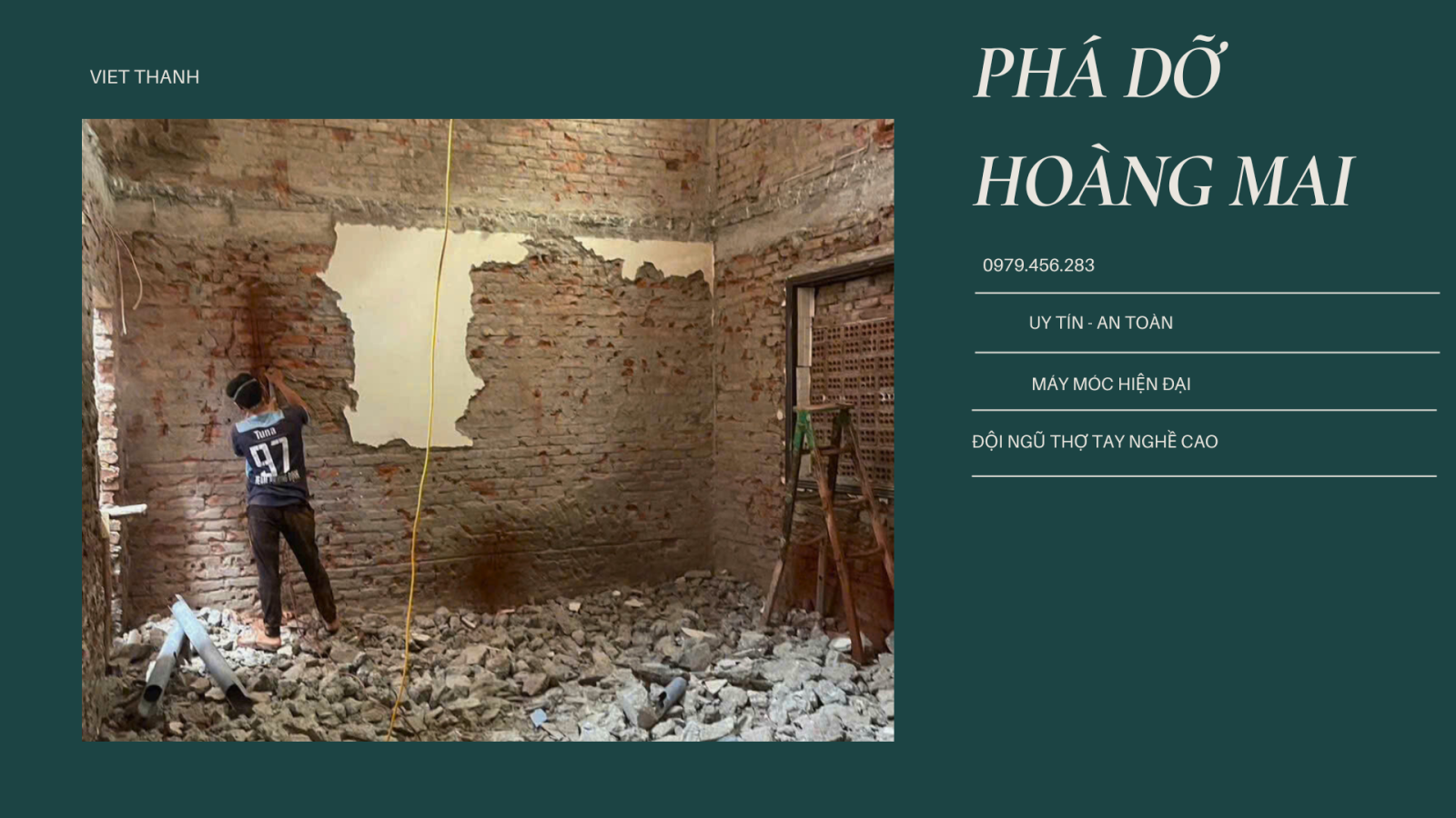 Công ty thành lập hơn 20 năm. Vốn kinh nghiệm tích luỹ to lớn đã khiến mọi người tin tưởng. Nhiều công trình do Việt Thanh phá dỡ xây dựng rất thành công. Công ty tiếp tục rất vinh hạnh được làm " đối tác chiến lược " vững mạnh nhất trong những năm vừa qua tại khu vực Hoàng Mai. Chắc hẳn việc phá dỡ nhà tại hoàng mai là hai hạng mục ít người hiểu sâu về bản chất và các vấn đề cốt lõi của nó. Với mục đích mang lại giá trị tốt đẹp cho khách hàng, do đó Việt Thanh đề cập đến hạng mục này, nhằm mong muốn khách hàng tin tưởng và hiểu rõ hơn