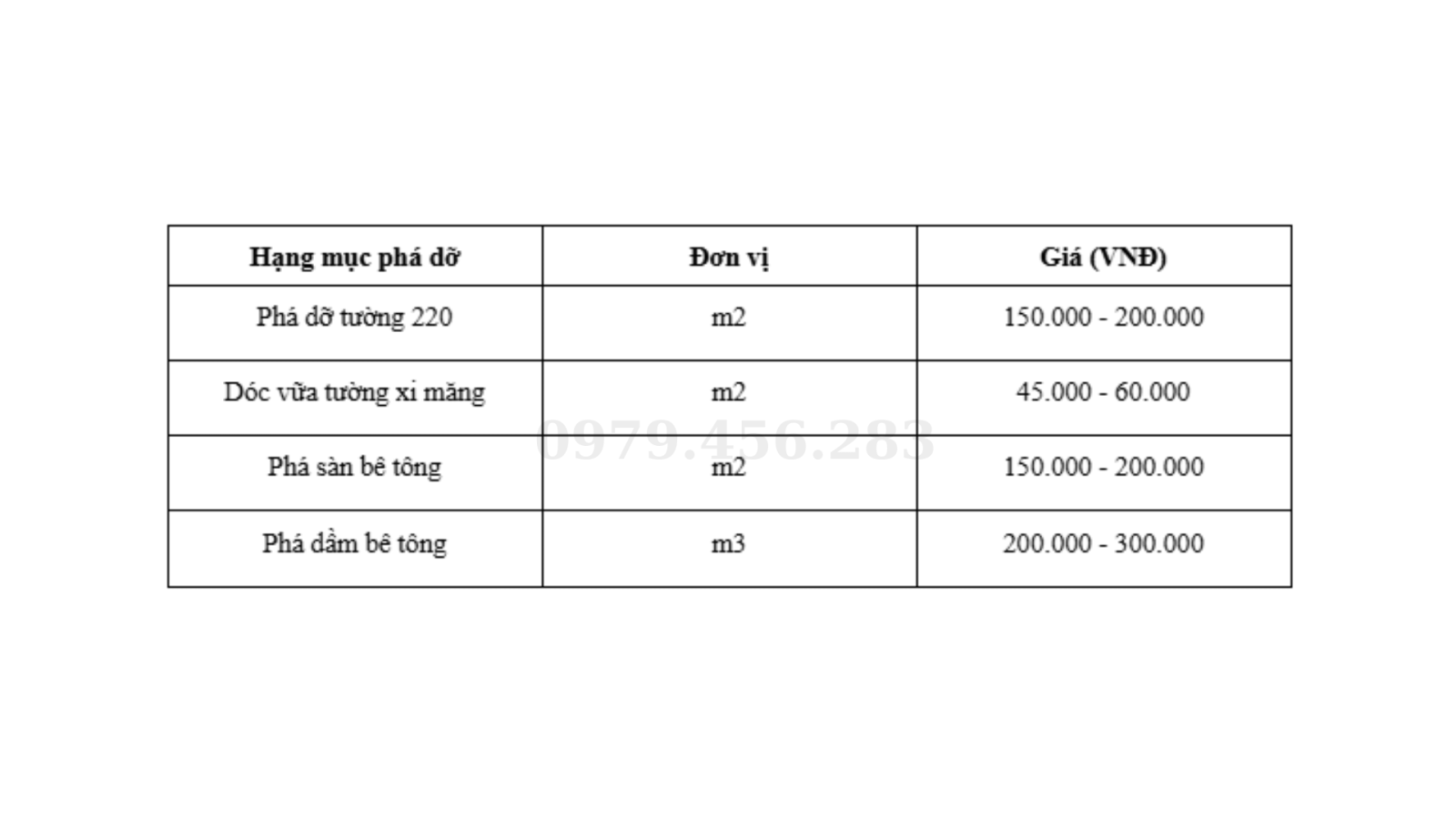 2. Bảng giá tham khảo phá dỡ bê tông