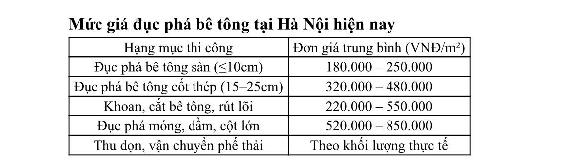 Mức giá đục phá bê tông tại Hà Nội hiện nay