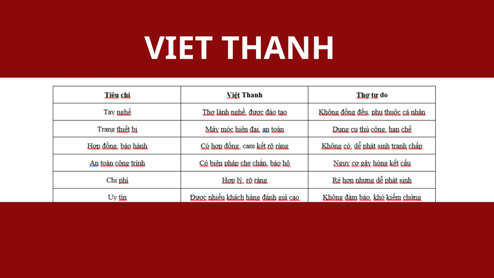 Nhiều khách hàng có câu hỏi. Tại sao chi phí nhân công, thợ bên Việt Thanh lại cao hơn so với chi phí ở ngoài. Mặc dù có cao hơn vài đồng, hơn thấp khoảng từ 10-20 đồng. Nhưng so về chất lượng, Việt Thanh có cam kết và quy trình rõ ràng. Liệu rằng thợ tự do có an toàn hay không, và chất lượng ra sao. Hay chỉ tăng tỉ lệ rủi ro.