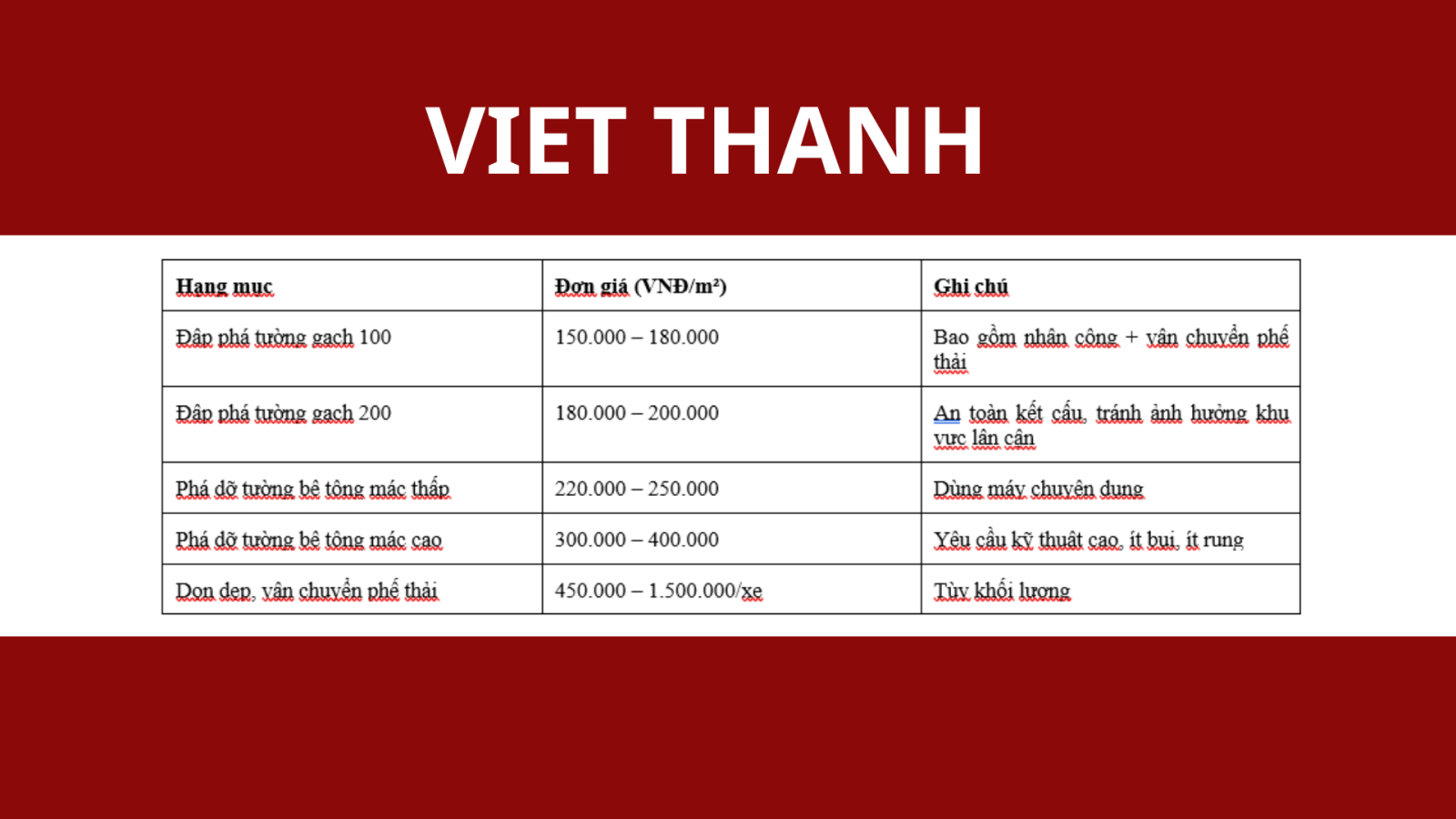 Để khách hàng yên tâm hơn, chúng tôi đề ra các khoản chi phí tham khảo. Nhằm phục vụ công tác chuẩn bị kinh phí cho gia đình. Giá dịch vụ có thể thay đổi tùy thuộc vào độ dày tường, vị trí công trình, diện tích cần phá. Dưới đây là bảng giá tham khảo của Việt Thanh: