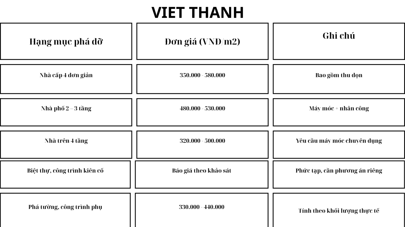 Nếu bạn đang tìm đơn vị phá dỡ nhà uy tín, giá rẻ tại Hà Nội, hãy liên hệ ngay Việt Thanh để được khảo sát và báo giá miễn phí.
