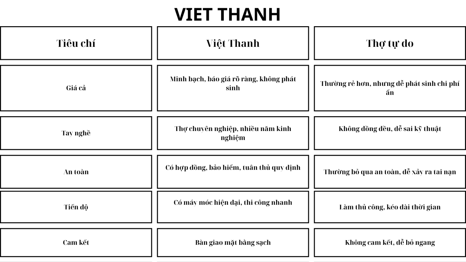 Vậy Thợ tự do có nhiều rủi ro cao hơn đội ngũ thợ chuyên nghiệp của Việt Thanh. Thợ tự do không đảm bảo cho sự an toàn của công nhân khi đang thi công, ảnh hưởng tới công trình bên cạnh. Còn riêng về Việt Thanh, đội ngũ thợ luôn đảm bảo thực hiện đúng quy trình và giá cả hợp lý, không phát sinh thêm chi phí ngoài nào.