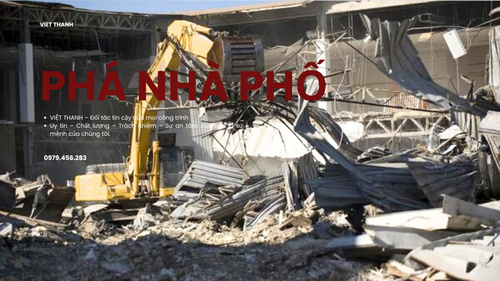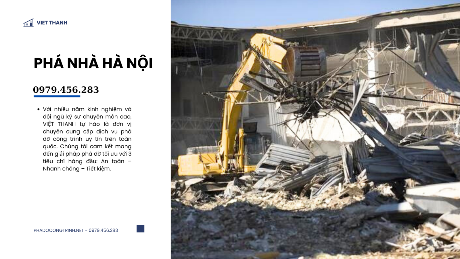 Một công ty phá dỡ đáng tin cậy không chỉ đảm bảo tiến độ nhanh, chất lượng an toàn, mà còn mang lại trách nhiệm pháp lý rõ ràng và dịch vụ chuyên nghiệp. Lựa chọn đúng đơn vị thi công sẽ giúp quý khách tránh rủi ro về tai nạn lao động, hư hại công trình lân cận hay phát sinh chi phí ngoài dự kiến. Quyết định hôm nay chính là nền móng vững chắc cho ngôi nhà ngày mai. Vì hãy dựa vào tiêu chí lựa chọn đơn vị thi công uy tín để khách hàng có một sự lựa chọn sáng suốt
