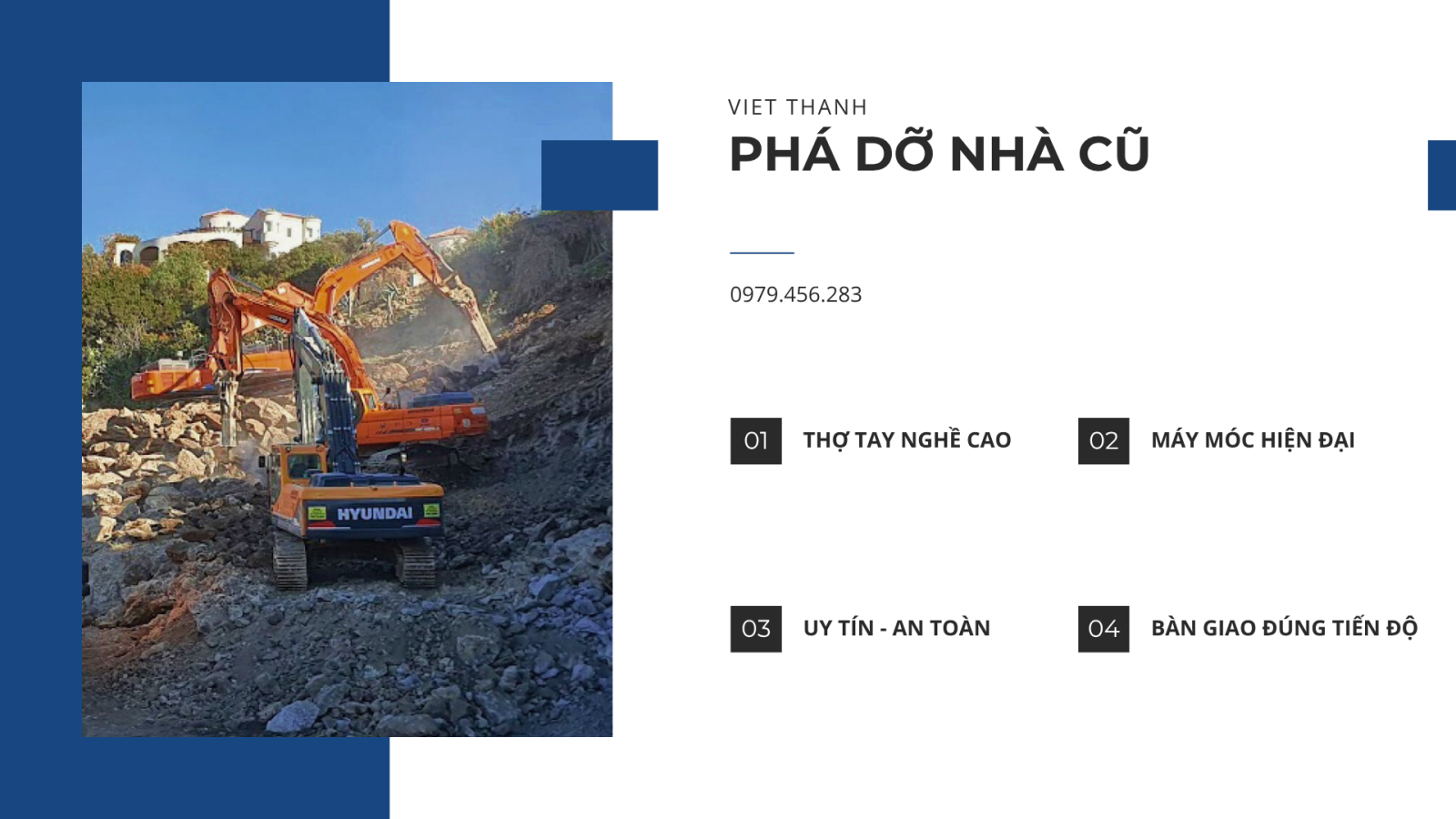 Việt Thanh sở hữu đội ngũ kỹ thuật nhiều năm kinh nghiệm, hệ thống máy móc hiện đại cùng quy trình thi công an toàn, nhanh chóng và đúng tiến độ. Không chỉ thực hiện phá dỡ nhà ở, công ty còn nhận phá dỡ nhà xưởng, công trình dân dụng và công nghiệp với bảng giá cạnh tranh, rõ ràng và không phát sinh chi phí ẩn. Đặc biệt, Việt Thanh luôn cam kết đảm bảo an toàn tuyệt đối cho công trình lân cận và người lao động, hỗ trợ vận chuyển, xử lý phế thải đúng quy định, sạch sẽ, gọn gàng. Bên cạnh đó còn tư vấn giải pháp phá dỡ tối ưu giúp khách hàng tiết kiệm chi phí và tận dụng vật liệu cũ hiệu quả. Chính sự chuyên nghiệp và uy tín đó đã giúp Việt Thanh trở thành lựa chọn hàng đầu khi khách hàng cần tìm dịch vụ phá dỡ nhà cũ chất lượng và tiết kiệm.