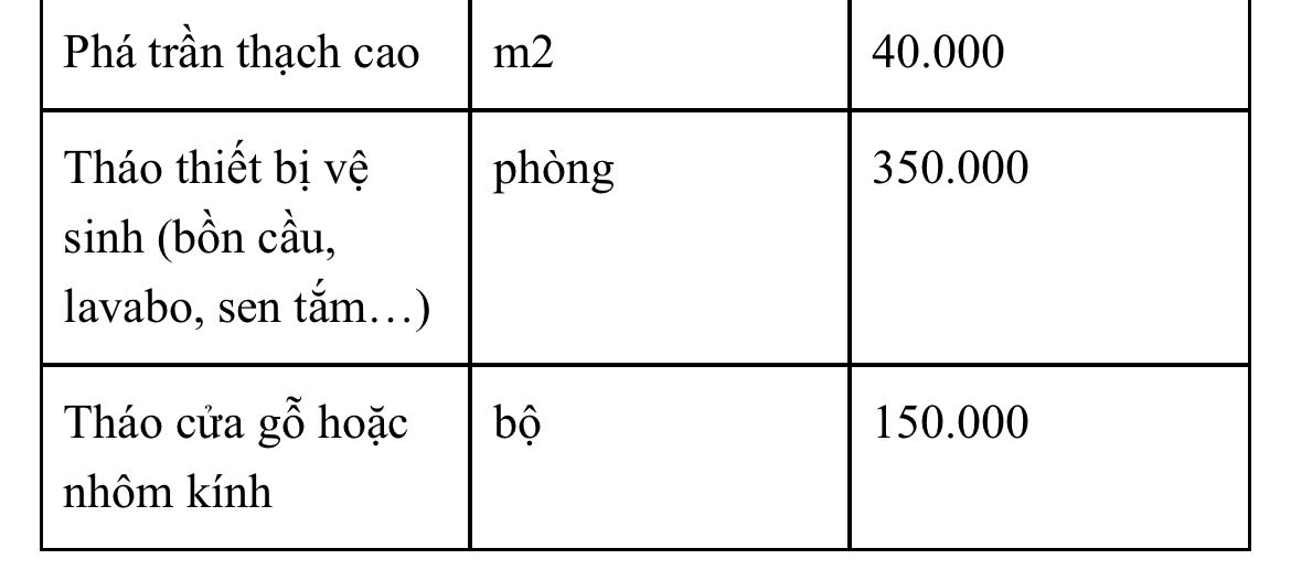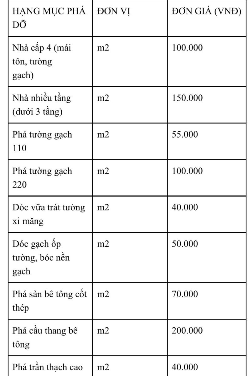 2. Bảng giá phá dỡ nhà tại Hà Nội tham khảo để không bị “chặt chém”