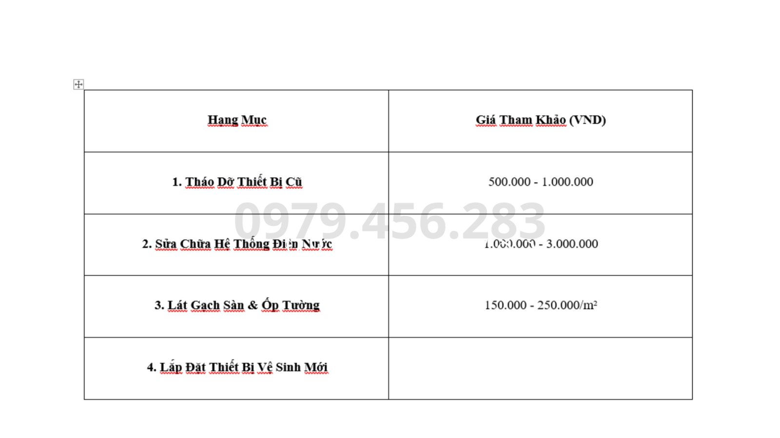 Bảng Giá Tham Khảo Cải Tạo Nhà Vệ Sinh (Theo Hạng Mục)