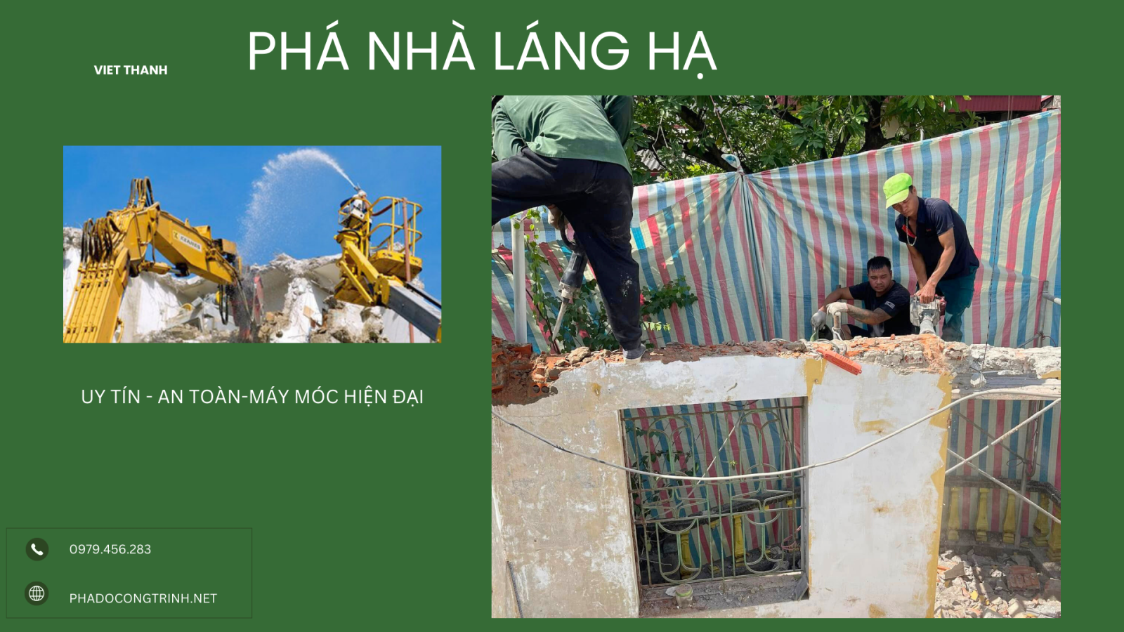 Chúng tôi sở hữu đội ngũ kỹ sư và công nhân nhiều năm kinh nghiệm cùng với trang thiết bị hiện đại, giúp quá trình phá dỡ diễn ra nhanh chóng và hiệu quả. Việc lựa chọn dịch vụ trọn gói của chúng tôi giúp gia chủ tiết kiệm thời gian, chi phí và tránh được các rủi ro phát sinh không mong muốn.