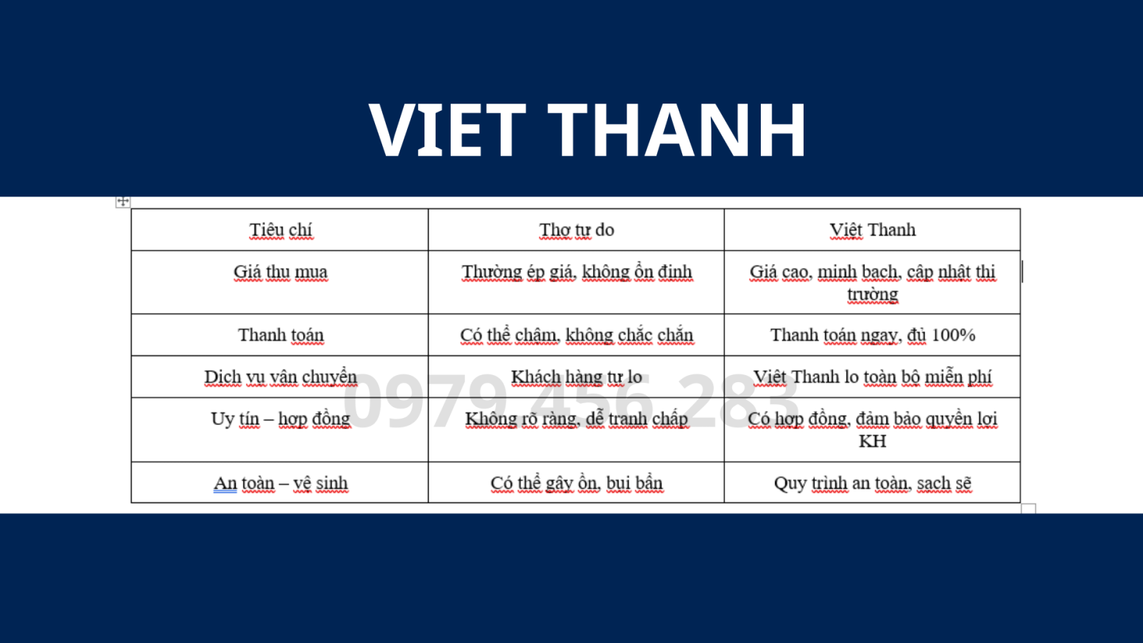 Quý khách hoàn toàn có thể yên tâm khi hợp tác với Việt Thanh, bởi chúng tôi luôn đặt chữ tín và sự minh bạch lên hàng đầu. Những rủi ro thường gặp ở các cơ sở nhỏ lẻ, Việt Thanh cam kết tuyệt đối tránh xa, nhằm mang đến cho quý khách trải nghiệm thuận tiện, an toàn và chuyên nghiệp nhất.