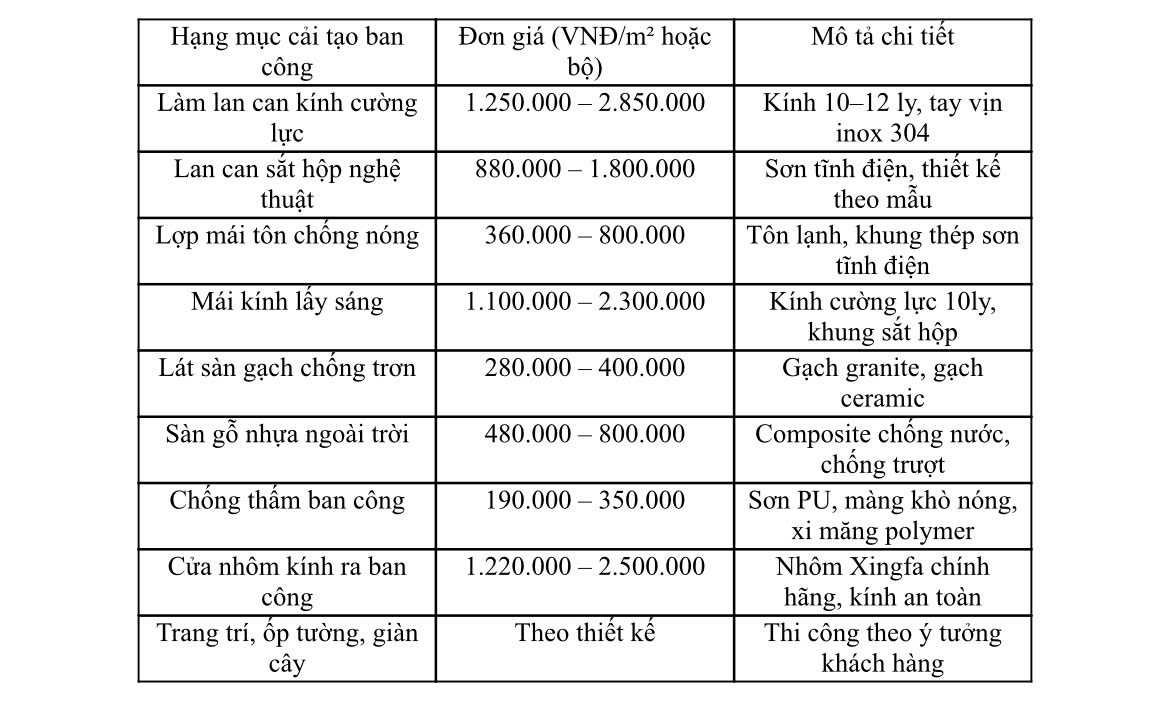 Thống nhất về giá cả, công ty cải tạo ban công báo giá minh bạch từng hạng mục như: nhân công, vật liệu, tiến độ thi công và các chi phí có thể phát sinh